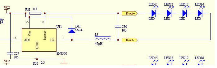 彩燈驅(qū)動電路采用SN3350,應(yīng)用其推薦典型電路,增加C30,減小輸出電流紋波,提高發(fā)光穩(wěn)定度。亮度控制采用直流電壓調(diào)整方式,電路相對簡單,無噪聲,出光無閃爍。