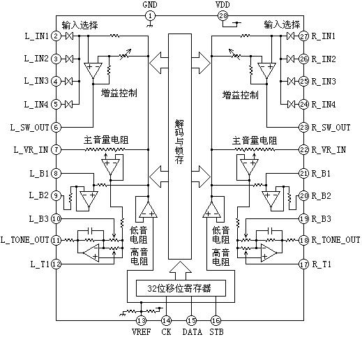 3. 輸入選擇:四個輸入信號的任意一個都有四個增益選擇:0dB,6dB,12dB,18dB
