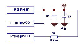3、 HT6809的VDD端布線注意事項(xiàng):HT6809的PVDD腳干擾較大,為了不干擾HT6809的AVDD,PVDD取從系統(tǒng)總電源處(電源入口)取電,電源入口處有大電容可以對PVDD產(chǎn)生的紋波進(jìn)行濾波,濾波后再把電源供給AVDD和系統(tǒng)上其他需要電源的地方。下圖為示意圖: