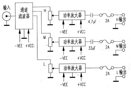 為了改變這種情況,產(chǎn)生了多通道放大器方式。在前置放大器之后用有源濾波器分割頻帶,各頻段有自己的功率放大器和揚(yáng)聲器,各頻段的電平在各功率放大器之前用電位器調(diào)整。這種方式的優(yōu)點(diǎn)是顯而易見的,它取消了前述LC網(wǎng)絡(luò),又能有效地利用各個揚(yáng)聲器的效率;同時,也降低了對功率放大器的頻率要求,輸出功率也可以小一些;這種結(jié)構(gòu)示于圖1。其關(guān)鍵電路是有源濾波器。
