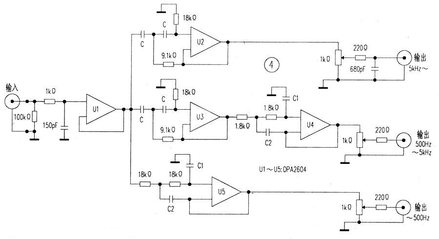 其低頻濾波器和高頻濾波器即是前面的設(shè)計(jì)例:中頻采用了帶通濾波器。由一級高通濾波器和一級低通濾波器組合而成,其R、C的計(jì)算與設(shè)計(jì)例相同。這里把低通濾波器設(shè)置在高通濾波器之后可以減少殘留噪聲,在濾波器之前設(shè)置一緩沖器有利于與音源的匹配,其輸入端的1kΩ和150pF用于限制輸入信號的帶寬:各濾波器的輸出端均用lkΩ的10圈線繞電位器作輸出電平調(diào)整。