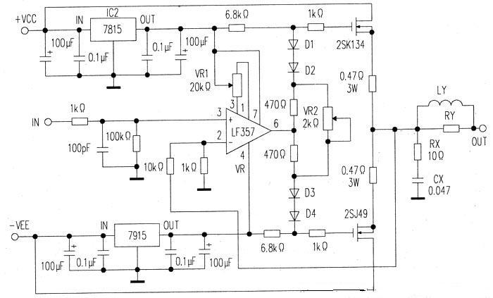 三路濾波器的輸出信號分別接至相同的三個功率放大器,其電路示于圖6。首先用輸入級為FET的運(yùn)放LF357作電流緩沖,末級功放管采用高頻特性好的MOSFET,偏置電路用二極管和電阻構(gòu)成,利用半可變電阻VR2設(shè)置靜態(tài)電流,靜態(tài)電流的測定可在無信號時測量源級電阻(0.47Ω)兩端電壓,然后利用公式I=U/R算出。末級負(fù)反饋從MOSFET的源極加到運(yùn)放的反相端。由于用作驅(qū)動的運(yùn)算放大器的電源電壓不能過高,限制了功放的最大輸出。如運(yùn)放電源電壓為±15V,驅(qū)動級最大輸出電壓為±12V=24V,揚(yáng)聲器阻抗RL=8Ω.則末級最大輸出功率P=Vcc×(Vcc/8RL)=24×24/64=9W。這個功率似乎偏小,但實(shí)際上這只是一個頻段的輸出功率,加上另外兩個頻段的輸出功率,已完全適用。