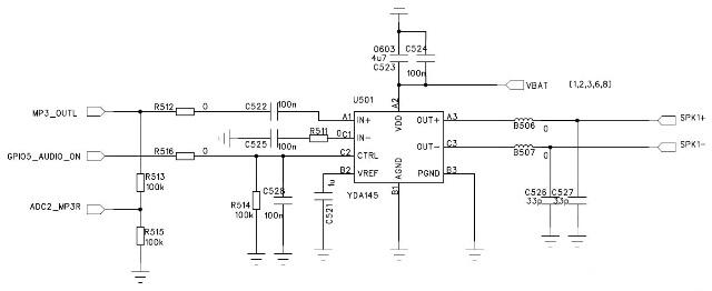 在手機(jī)與綜測(cè)儀連接時(shí),開(kāi)啟免提(音頻功放YDA145打開(kāi)),射頻指標(biāo)(調(diào)制譜,頻相誤差,接收靈敏度)嚴(yán)重變差導(dǎo)致連接中斷。去掉speaker使YDA145輸出開(kāi)路時(shí),情況依舊(干擾程度變大,射頻指標(biāo)更易受干擾)。但當(dāng)免提音量降低時(shí)(減小YDA145輸入信號(hào)幅度)射頻指標(biāo)不再受影響。B506,B507都為600ohm@100MHz 磁珠,R512為75Kohm電阻R522,C526,C527都為1000pF電容。