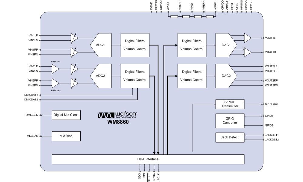 這兩款器件都和業(yè)界標(biāo)準(zhǔn)的高清晰度音頻接口完全兼容,并且符合視窗硬件質(zhì)量實(shí)驗(yàn)室(WHQL)的規(guī)范。WM8850帶有三個(gè)高性能的立體聲數(shù)字模擬轉(zhuǎn)換器(DAC),能夠?qū)崿F(xiàn)六個(gè)通道的高清晰度音頻,是5.1多通道環(huán)繞聲音頻系統(tǒng)的理想之選;同時(shí),WM8860集成了兩個(gè)高性能的立體聲DAC,能夠?qū)崿F(xiàn)四個(gè)通道的高清晰度音頻。隨之附帶的軟件可確保高級(jí)應(yīng)用場(chǎng)景、低功耗運(yùn)行和基于Windows7的音頻框架,同時(shí)也支持Windows Vista、XP 和 Linux。而核心部分正是歐勝的Audio Studio,它為可用性和特色性能建立了新的基準(zhǔn),此外還嵌入了歐勝的SoundStage聲效引擎。