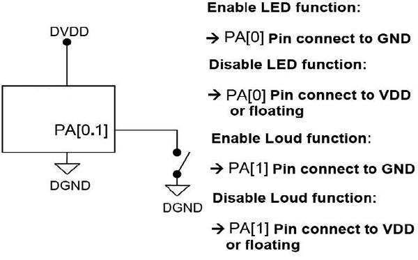 2. Loud控制功能位于PIN PA[1],當(dāng)PA[1]接地表示Loud功能開(kāi)啟(音量調(diào)整最后三階開(kāi)放),空接或接VDD則Loud功能關(guān)閉。