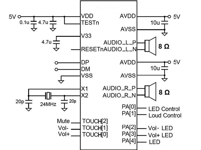 該芯片主要用于USB音箱,這種音箱不需要額外的電源線、音頻線、驅(qū)動(dòng)程序,只需一根USB線與主機(jī)連接即可播放音樂(lè),音質(zhì)可滿足普通大眾用戶需求,方便快捷。同時(shí)該芯片最大特點(diǎn)是內(nèi)置觸控通道及LED燈控制,單芯片就可以很容易的實(shí)現(xiàn)炫酷的觸摸方式調(diào)音,降低了觸控開(kāi)發(fā)的難度和產(chǎn)品成本。管教兼容TP6902
