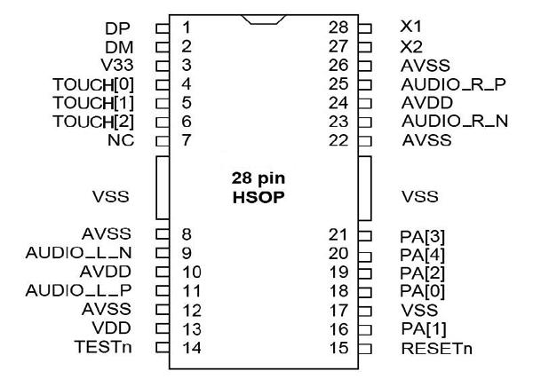 1. LED控制功能位于PIN PA[0],當(dāng)PA[0]接地表示播放音樂(lè)時(shí)LED為閃爍功能,空接或接VDD則LED恒亮。