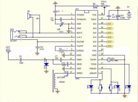 4.PIN15和PIN16分別是模式指示燈接口,外接LED燈,常開(kāi)開(kāi)關(guān)和一個(gè)電阻,當(dāng)按下FMKEY時(shí),切換到FM模式,FM指示燈亮,當(dāng)按下AMKEY時(shí),切換到AM模式,AM指示燈亮,需要注意FM指示燈和AMKEY并聯(lián),AM指示燈和FMKEY并聯(lián);