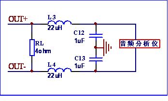免濾波D類(lèi)功放IC的測(cè)試(我公司標(biāo)稱(chēng)的功率測(cè)試方式)采用如上方式,其中RL為負(fù)載。免濾波D類(lèi)功放IC采用的調(diào)制方案無(wú)需濾波器便能正常工作,但在做相關(guān)測(cè)試時(shí),由于大多數(shù)分析儀、測(cè)試儀無(wú)法正確處理快速變化的方波信號(hào),需要在后端接入濾波器再接入分析儀,使得分析儀能正確測(cè)試。濾波器可以使用專(zhuān)業(yè)的音頻濾波器,也可以使用簡(jiǎn)單的RC、LC低通濾波器。如上圖11,采用的是LC低通濾波器,由于分析儀內(nèi)阻很大,電感的阻值可忽略。
