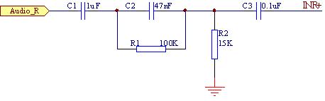 將輸入端接法改為如下圖6(列出右聲道,左聲道同樣處理),相關(guān)值需視具體情況微調(diào);