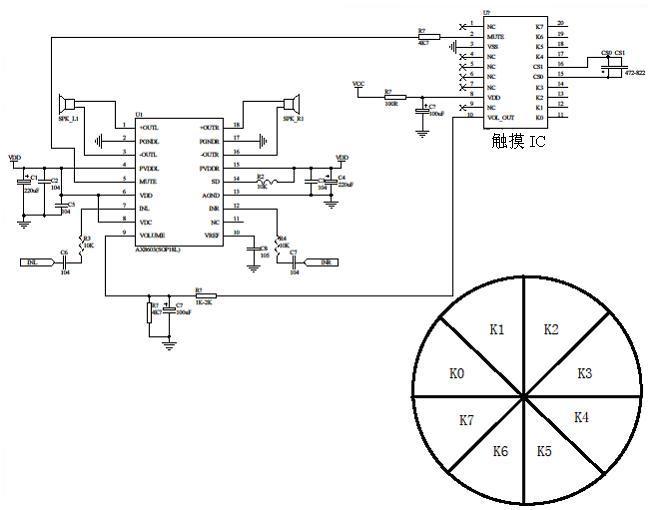 使用觸摸轉(zhuǎn)輪同步控制音量,可以讓用戶在享受美妙音樂的同時(shí),提供極佳的真實(shí)觸感反饋及體驗(yàn)。下圖為電路原理圖: