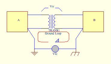 如上圖,一個(gè)在二個(gè)不同地點(diǎn)接地的系統(tǒng),在接地點(diǎn)之間有電位差(如地線上的電阻加上車載設(shè)備的大電流就是產(chǎn)生這種情況),這種情況下在電路中就會(huì)產(chǎn)生一個(gè)有害的噪聲電壓(表現(xiàn)出來就是喇叭中出現(xiàn)的電流聲)。噪聲電壓和信號(hào)水平之比的大小很重要,如果信噪比使電路的正常工作愛到影響,就必須采取一定的措施了。