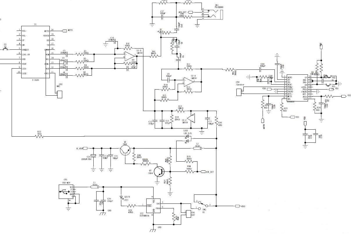 上圖為比較典型藍牙小音箱設(shè)計原理圖,其主要器件為: