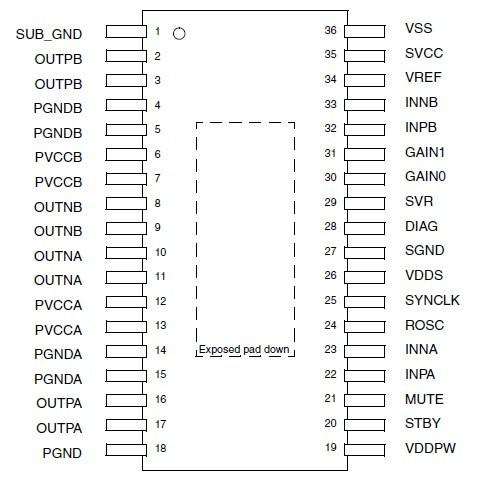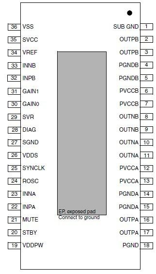 圖1 TDA7491LP/TDA7491P/TDA7491HV/TDA7492P管教排列(PowerSSO-36封裝,散熱片在底部)