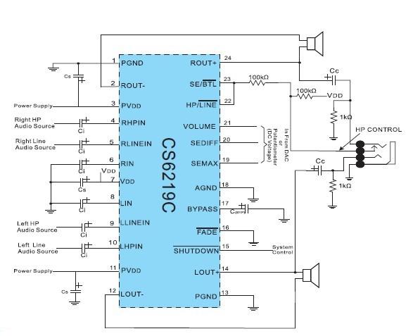 .若不需要音量調(diào)節(jié)功能,則將VOLUME、SEMAX端接電源,SEDIFF端接地,此時(shí)對應(yīng)的BTL的增益為20dB,耳機(jī)增益為14dB.