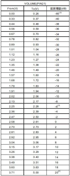 VOLUME腳調(diào)節(jié)BTL模式的音量。例如:當(dāng)VDD=5V,通過變阻器調(diào)節(jié)VOLUME電壓=2.95V,則BTL下的增益為6dB(具體增益對應(yīng)的電壓點(diǎn)請查表1)。