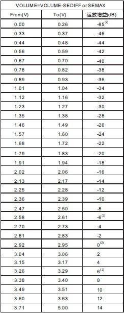 SEDIFF腳調(diào)節(jié)耳機(jī)模式的音量。耳機(jī)音量大小取決于VOLUME腳、SEDIFF腳的電壓差。例如:當(dāng)VDD=5V時(shí),VOLUME電壓=2.95V,SEDIFF電壓=1V,則耳機(jī)增益為-18dB(具體增益對應(yīng)的電壓點(diǎn)請查表2)。.此腳對BTL模式無效
