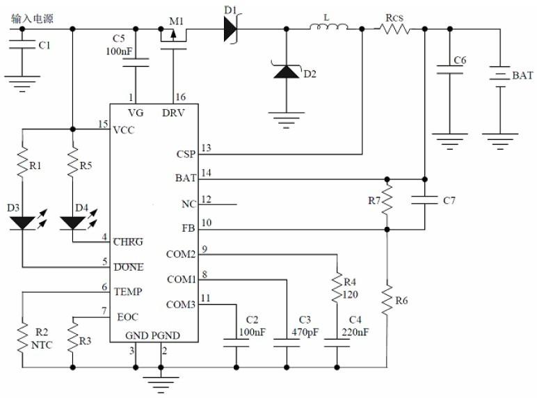 ⑥電阻Rcs 的選擇:當(dāng)充電電流為1A 時(shí),Rcs=0.12Ω;當(dāng)充電電流為2A 時(shí),Rcs=0.06Ω;當(dāng)充電電流為3A 時(shí),Rcs=0.04Ω;當(dāng)充電電流為4A 時(shí),Rcs=0.03Ω;當(dāng)充電電流為5A 時(shí),Rcs=0.024Ω。