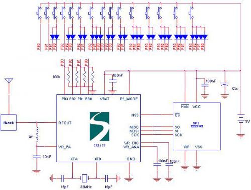 PB(3:0)是按鍵接口,如果使用二極管編碼電路,最多可以支持15個按鍵。平時SX1230處于睡眠狀態(tài),按鍵動作將喚醒芯片并進行去抖,然后發(fā)送該按鍵對應(yīng)的RF數(shù)據(jù)包,完成后再回到睡眠狀態(tài)。