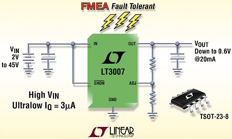 凌力爾特公司(Linear Technology Corporation)推出 LT3007,該器件是一個(gè)高壓、微功率、基于堅(jiān)固 PNP 的 LDO 系列之最新成員,具備 3µA 超低靜態(tài)電流。LT3007 具備高輸入電壓能力,電壓范圍為 2.0V 至 45V,并提供范圍為 0.6V 至 44.5V 的可調(diào)輸出電壓,能用于種類繁多的應(yīng)用領(lǐng)域。LT3007 的管腳引出線符合 FMEA (失效模式與影響分析) 驗(yàn)證標(biāo)準(zhǔn),在相鄰引腳發(fā)生短路或者一個(gè)引腳處于浮置狀態(tài)時(shí),輸出保持等于或低于穩(wěn)定電壓。該器件的 3µA 靜態(tài)電流和停機(jī)電流 (<1µA) 實(shí)現(xiàn)了超低備用功耗,使該 IC 成為不需要停機(jī)的應(yīng)用之卓越選擇,或者非常適用于那些需要適度輸出驅(qū)動(dòng)能力和高輸入電壓的應(yīng)用,例如遠(yuǎn)程監(jiān)視應(yīng)用以及用于需要延長(zhǎng)運(yùn)行時(shí)間的“保持運(yùn)作”系統(tǒng)之低電流電池供電型存儲(chǔ)器。