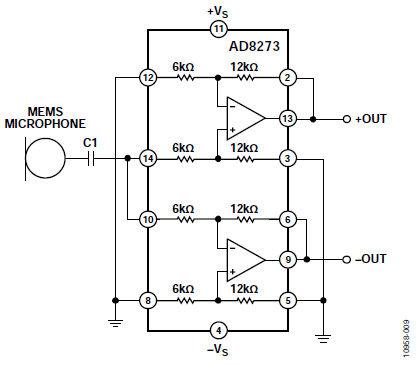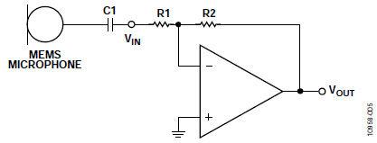 單個運(yùn)算放大器可以簡單地作為MEMS麥克風(fēng)輸出的前置放大器應(yīng)用于電路中。MEMS麥克風(fēng)是一個單端輸出設(shè)備,因此單個運(yùn)算放大器級可用于為麥克風(fēng)信號增加增益或僅用于緩沖輸出。