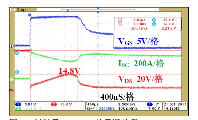 功率MOSFET的跨導Gfs也會影響功率MOSFET的導通損耗。當MOSFET的Gfs較小且短路電流很大時,MOSFET將工作在飽和區(qū),其飽和導通壓降很大,如圖3所示,MOSFET的VDS(ON)在短路時達到14.8V,MOSFET功耗會很大,從而導致MOSFET因過功耗而失效。如果MOSFET沒有工作在飽和區(qū),則其導通壓降應該只有幾伏,如圖2(a) 中的VDS所示。