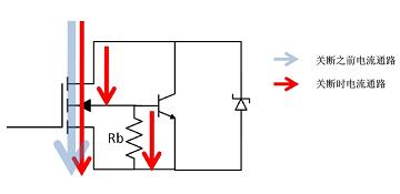提高關斷的速度,可以減小關斷損耗,但這會產生另外的問題。MOSFET的等效電路如圖4所示,其包含了一個寄生的三極管。在MOSFET短路期間,電流全部通過MOSFET溝道流過,當MOSFET快速關斷時,其部分電流會經過Rb流過,從而增加三極管的基極電壓,使寄生三極管導通,MOSFET提前失效。