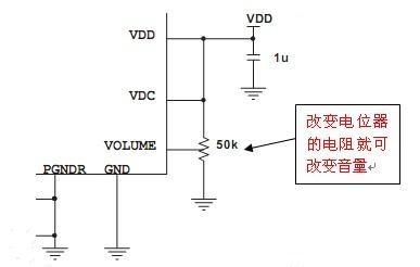 直流音量(DC VOLUME):通過(guò)可變電阻(通常是電位器)改變VOLUME端的電壓達(dá)到調(diào)節(jié)音量的目的。
