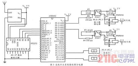 (2) 無線接收系統(tǒng)電路: 接收系統(tǒng)電路主要由接收模塊( 包括射頻模塊、芯片PT2272 及外圍電路) 、繼電器電路和負載電路組成, 如圖3 所示。PT2272 的1~8 腳是解碼地址端, 每個地址端可以設定“ 高電平” ( 該腳接5 V) 、“ 低電平” ( 該腳接地) 、“ 懸空” 三種狀態(tài), 該解碼地址的設定與PT2272 的地址編碼相對應。當射頻模塊接收到由發(fā)射電路發(fā)出的信號后,PT2272 進行地址碼比較核對( 解碼), 若地址碼核對正確, 則發(fā)射模塊TE 腳( 編碼啟動端用于多數(shù)據(jù)的編碼發(fā)射, 低電平有效) 發(fā)出的信號經接射頻模塊由Din 腳(14 引腳) 進入PT2272 , 同時數(shù)據(jù)經PT2272 的數(shù)據(jù)輸出腳D0~D3 (10~13 腳) 進入單片機; 反之PT2272 的數(shù)據(jù)輸出腳則無任何動作。當信號進入單片機后, 單片機對其進行分析并作出相應的控制。如果接收到的第一路信號為高電平, 單片機控制的數(shù)碼顯示管會顯示“11” ( 第一個“1” 表示第一路信號,第二個“1” 表示該信號為高電平) , 同時單片機向繼電器電路發(fā)出高電平, 繼電器吸合, 負載電路工作; 當?shù)诙谓邮盏礁唠娖剑?通過單片機將對應的端口電平置零;當?shù)谌谓邮盏礁唠娖綍r再次置1, 如此循環(huán); 當數(shù)碼管的顯示為“1 1” 時( 第一個1 表示第一路信號, 第二1 表示該信號為低電平) , 此時單片機向繼電器電路發(fā)出低電平, 繼電器斷開, 負載停止工作。利用繼電器和數(shù)碼管可以實現(xiàn)靈活控制并清晰地顯示。