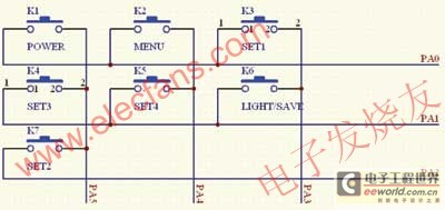 由于ST20P18的I/O口有限,故在鍵盤電路中采用掃描的方式來實(shí)現(xiàn)。該電路的實(shí)現(xiàn)方式如圖2所示。其工作的基本原理是:單片機(jī)初始化后先設(shè)置 PA0至PA5、6個I/O口均為輸入方式。以K1為研究對象,先設(shè)置PA0口為高電平,設(shè)置PA5口為低電平,當(dāng)K1按鍵按下后,PA0則由高電平跳變?yōu)榈碗娖,并產(chǎn)生中斷。單片機(jī)響應(yīng)該中斷,執(zhí)行中斷服務(wù)程序。同理,其他6個按鍵也是按照該方式工作的。單片機(jī)掃描原則是自上而下,自左而右的。