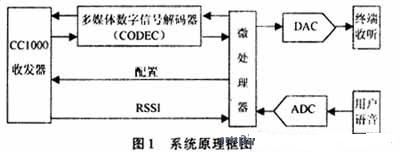 該系統(tǒng)的主體部分由微處理器(可以由實際應(yīng)用 選取不同的型號)、收發(fā)器、解碼器、A/D與D/A轉(zhuǎn)換器構(gòu)成。以微處理器為核心控制用戶語音信號在傳送到無線電頻率前被采樣、數(shù)字化和被壓縮,接收到的信號解壓后再轉(zhuǎn)回模擬語音信號。