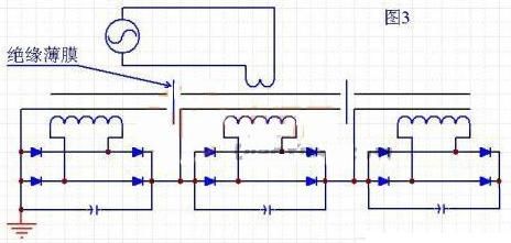 這種方式的電路示意圖如圖3所示。特點是,磁芯是由多段組合而成,每段磁芯之間都用絕緣性能很好的薄膜進行絕緣。每段磁芯都有一個次級繞組。優(yōu)點是:適合較大功率的輸出。變壓器數(shù)量少,只需要一副磁芯。每段次級繞組與磁芯的電壓差小,次級繞組對磁芯的絕緣容易處理。缺點是:磁芯是分段的,結(jié)構(gòu)復雜。磁芯有氣隙,分段越多,等效氣隙越大,磁芯固定困難。
