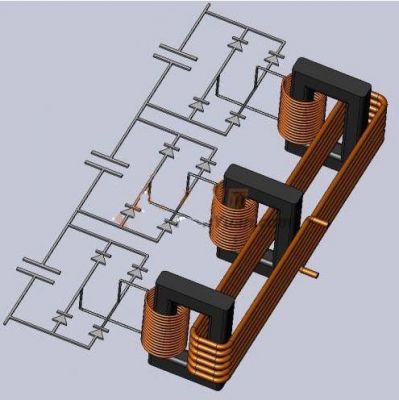這種方式的電路示意圖如圖4所示。為了能看的直觀一些,這里畫了一張3D的圖紙,為了畫出這個示意圖,畫了好長時間,特別是初級的那個線圈,看上去簡單,很費了一番力氣!這種結(jié)構(gòu)的特點是多個變壓器組合,初級為串聯(lián)結(jié)構(gòu),次級獨立整流以后再串聯(lián)。優(yōu)點是:適合大功率的輸出,變壓器的升壓比不大。缺點是:初、次級對磁芯之間總有一個絕緣要求高,需要多個變壓器。