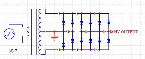 電路結(jié)構(gòu)見圖7,這種結(jié)構(gòu)的特點是高壓變壓器的次級帶中間抽頭。這種結(jié)構(gòu)的優(yōu)點是:倍壓的電壓跌落比半波多倍壓方式小很多。紋波也小很多。缺點是:變壓器的次級需要抽頭,輸出同樣的高壓,變壓器的次級匝數(shù)增加了一倍。元件多,成本高。