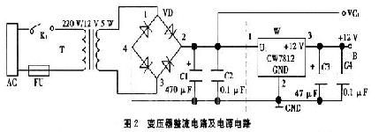 變壓器整流電路和穩(wěn)壓電源電路(如圖2虛線左邊所示),其主要由變壓器、二極管橋式電路、電容構(gòu)成。其中變壓器采用常規(guī)的鐵心變壓器,并將公共電網(wǎng)中的220 V交流電變?yōu)?2 V交流電,再通過二極管橋式電路進(jìn)行整流和電容C1濾波。整流信號(hào)由VC1引出。在此基礎(chǔ)上再接三端穩(wěn)壓器CW7812及電容C3、C4(如圖2虛線右邊所示),這樣整個(gè)電路就構(gòu)成穩(wěn)壓電源電路。由B點(diǎn)提供+12 V的直流電壓。
