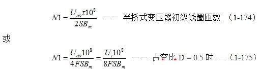 (1-176)式就是計算半橋式逆變開關(guān)電源變壓器初、次級線圈匝數(shù)比的公式。式中,N1為變壓器初級線圈N1繞組的匝數(shù),N2為變壓器次級線圈的匝數(shù),Uo輸出電壓的有效值,Ui為直流輸入電壓,Upa輸出電壓的半波平均值。