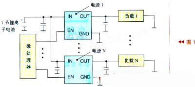 微處理器通過控制電源的工作來實現(xiàn)負(fù)載管理,如圖1所示,圖1中有N個電源,每個電源帶一個負(fù)載(有N個負(fù)載)。每一個電源都有一個使能端(EN,高電平有效)或關(guān)閉電源控制端(SHDN,低電平有效),微處理器的I/O口與電源的EN端或SHDN端連接,輸出邏輯電平來控制電源的開通或關(guān)斷,這樣就可以實現(xiàn)負(fù)載管理。例如,某產(chǎn)品有6個電源,在某種工作狀態(tài)時,需要電源1~3開通,則負(fù)載1~3得電工作,電源4~6關(guān)斷,負(fù)載4~6失電不工作,只要在電源1~3的EN端加邏輯高電平,在電源4~6的EN端加低電平即可。