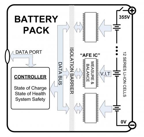 倘若把一個大型電池組拆分成若干個較小的模塊,則會使電氣連接的設(shè)計變得復(fù)雜化。在電池模塊和控制電路之間傳輸數(shù)據(jù)需要一個線束。線束將遭受嚴重的電磁干擾 (EMI)。必須仔細注意數(shù)據(jù)通信硬件和軟件。AFE IC 領(lǐng)域的新發(fā)明可以極大地降低數(shù)據(jù)通信的成本,同時保護電池組免受 EMI 影響。