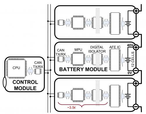 2012 年生產(chǎn)具備模塊化電池組的汽車一般采用結(jié)合的 CAN (控制器局域網(wǎng)) 通信和數(shù)字隔離器,如圖 4 所示。CAN 用兩條導(dǎo)線提供堅固的通信。一個小型微處理器 (MPU) 將數(shù)據(jù)從 CAN 協(xié)議轉(zhuǎn)換到 AFE IC 更簡單的 SPI 或 I2C 協(xié)議。模塊之間的隔離由一個數(shù)字隔離器 IC 提供,這有時需要一個隔離式電源。CAN 收發(fā)器、MPU 和隔離器 IC 合起來的成本大約為 3.5 歐元 (4.50 美元)。