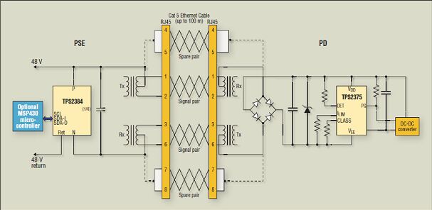 圖1、在本單端口 PoE 應用例子中,通過以太網線纜的信號對實現了電源供電;而通過備用雙絞線對實現了更多電力供應。
