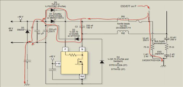 圖 5、本圖闡明了鐵氧體磁珠和鉗位二極管將正極ESD/EFT事件從 TPS2384 芯片的 N 終端轉移到底座接地的電流路徑。