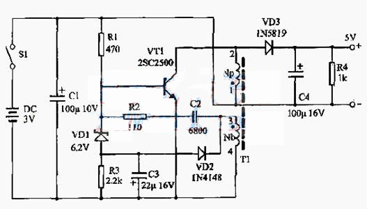 VD1、VD2、C3等組成穩(wěn)壓電路,在VT1截止期間,Nb感應(yīng)的3負(fù)4正的電壓經(jīng)VD2向C3充電,當(dāng)C3上的電壓(上負(fù)下正)大于6.2V時(shí).穩(wěn)壓二極管VD1開始導(dǎo)通起分流作用,減小VT1的基極電流,從而可以控制VT1的集電極電流Ic,達(dá)到穩(wěn)定輸出電壓的作用。
