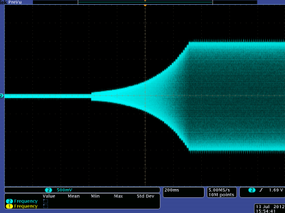 用 1kHz連續(xù)信號代替按鍵音,實測 TPA2028D1輸出波形如 Figure 4,信號緩慢增加,音量由小到大漸變。