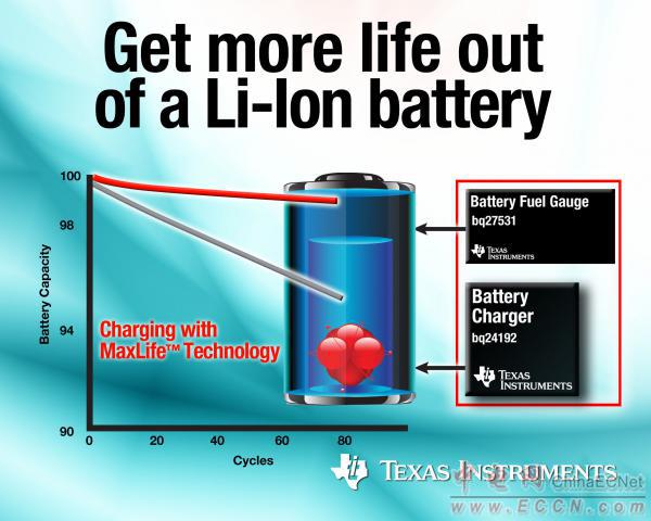 手機(jī)電池經(jīng)數(shù)月充放電后出現(xiàn)持續(xù)工作時間不長的情況,令手機(jī)用戶倍感困擾。TI MaxLife 技術(shù)采用創(chuàng)新老化建模系統(tǒng),可在最大限度縮短充電時間的同時,延長電池使用壽命(實驗室測試數(shù)據(jù)顯示:可延長達(dá) 30%)。MaxLife 算法建立在 TI 普及型 Impedance Track™ 電池容量測量技術(shù)基礎(chǔ)之上,可準(zhǔn)確預(yù)測并避免可能導(dǎo)致電池老化的充電情況。