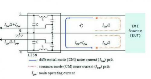從被測(cè)物體的電流路徑來(lái)看,干擾信號(hào)回流路徑可能通過(guò)地線,或者通過(guò)其它電網(wǎng),如圖1所示。通過(guò)地線的干擾電流在電源網(wǎng)上產(chǎn)生同相位的共模干擾電壓。通過(guò)其它線在兩根電源線上產(chǎn)生反相的差模干擾電壓。干擾電流的路徑如圖2所示。