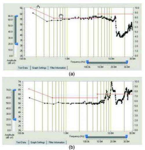 在標(biāo)準(zhǔn)電磁兼容性測(cè)試實(shí)驗(yàn)室可得到設(shè)備的總干擾情況,但無(wú)法了解設(shè)備的共模干擾和差模干擾特性。為了在測(cè)量中分辨共;蛘卟钅8蓴_信號(hào),通用的儀器是很難實(shí)現(xiàn)的。使用專用的傳導(dǎo)測(cè)試儀,可獲得設(shè)備的總干擾、共模干擾和差模干擾。測(cè)試結(jié)果如圖3所示。
