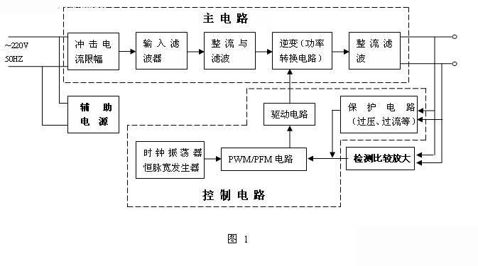開關(guān)電源大至由主電路、控制電路、檢測電路、輔助電源四大部份組成,見圖1。