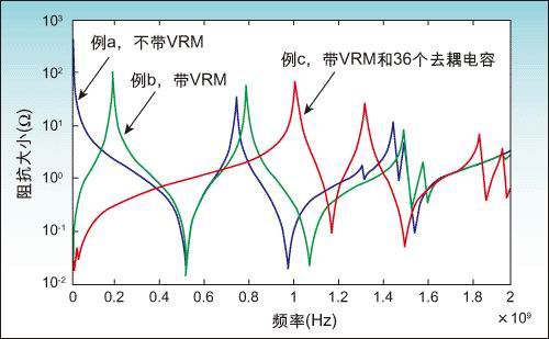 例子c的紅線,在板上放置了一些去耦電容后,那個200MHz的諧振峰被移到了很低的頻率處(<20MHz),并且諧振峰的峰值也降低了很多。第一個較強的諧振峰則出現(xiàn)在大約1GHz處。由此可見,通過在PCB上放置分立的去耦電容,電源供電系統(tǒng)在主要的工作頻率范圍內(nèi)可以實現(xiàn)較低的并且是平滑的交流阻抗響應(yīng)。因此,電源供電系統(tǒng)的噪聲也會很低。