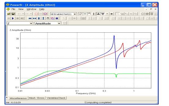 圖4顯示了在三種不同設(shè)置下,用Sigrity PowerSI計算得到的電源供電系統(tǒng)的輸入阻抗: