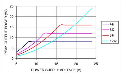 MOSFET輸出級的導通電阻會影響它的效率和峰值電流能力。降低負載的峰值電流可減少MOSFET的I2R損耗,進而提高效率。要降低峰值電流,應在保證輸出功率,以及D類放大器的電壓擺幅以及電源電壓的限制的條件下,選擇最大阻抗的揚聲器,如圖5所示。本例中,假設D類放大器的輸出電流為2A,電源電壓范圍為5V至24V。電源電壓大于等于8V時,4的負載電流將達到2A,相應的最大連續(xù)輸出功率為8W。如果8W的輸出功率能滿足要求,則可以考慮使用一個12揚聲器和15V供電電壓,此時的峰值電流限制在1.25A,對應的最大連續(xù)輸出功率為9.4W。此外,12負載的工作效率要比4負載的高出10%到15%,降低了功耗。實際效率的提高根據(jù)不同D類放大器而異。雖然大多數(shù)揚聲器的阻抗都采用4或8,但也可采用其他阻抗的揚聲器實現(xiàn)更高效的散熱。